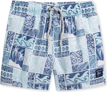 A beachy print adds to the fun of these kid-size swim trunks that are quick drying and water repellent.
