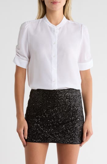 Gathered seams add subtle flair to the short sleeves of a polished button-front shirt designed to look chic on or off the clock.