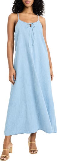 Refresh your warm-weather wardrobe with this denim midi dress styled with a front keyhole and adjustable straps.