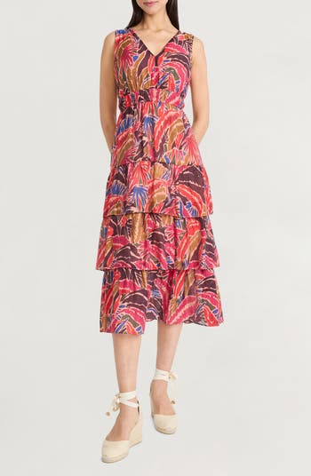 Floaty layered ruffles flutter gracefully on this sleeveless midi cut in a sleeveless silhouette and shaped by waistline shirring.