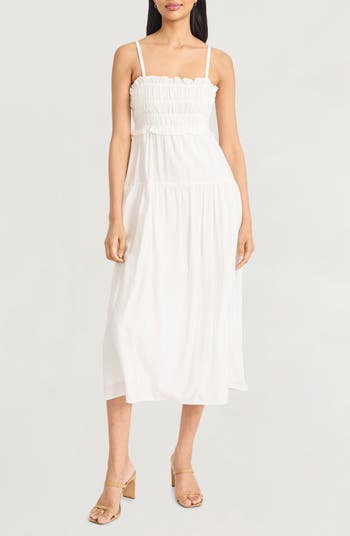 Breeze through warm days in this square-neck sundress fashioned with dainty ruffles, a smocked bodice and tiered silhouette.