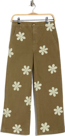 Painterly daises bloom all over these high-waisted, workwear-inspired pants that fit snug through the hips and flow into an easy wide leg.