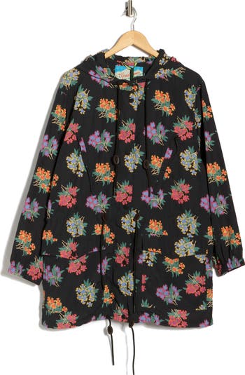 Scattered blooms brighten this hooded longline jacket cut from water-resistant, lightweight nylon and fashioned with plenty of pockets.