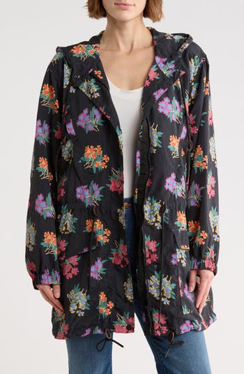 Scattered blooms brighten this hooded longline jacket cut from water-resistant, lightweight nylon and fashioned with plenty of pockets.