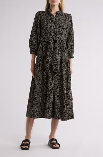 Feel your finest in this charming three-quarter sleeve cotton dress featuring a frilly collar, softly cinched waist and confetti print.