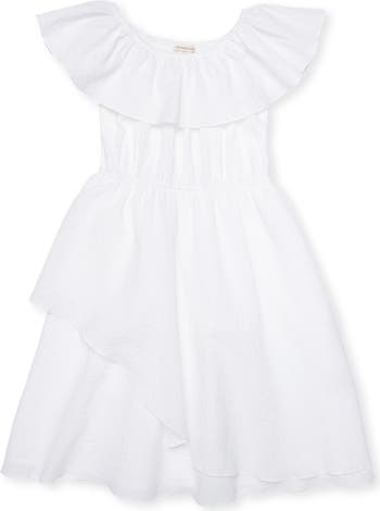 A fluttery neckline and asymmetric-tiered skirt bring modern fairy-tale vibes to this kid-sized dress made from crinkled crepe.