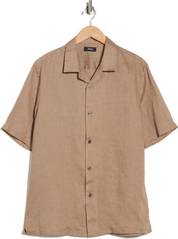 Made of a lightweight, linen fabric, this shirt features a spread collar and front-button closure for a classic look.
