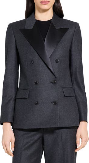 Smooth satin lapels provide a classic finish for this double-breasted tuxedo jacket fashioned from lightweight wool.