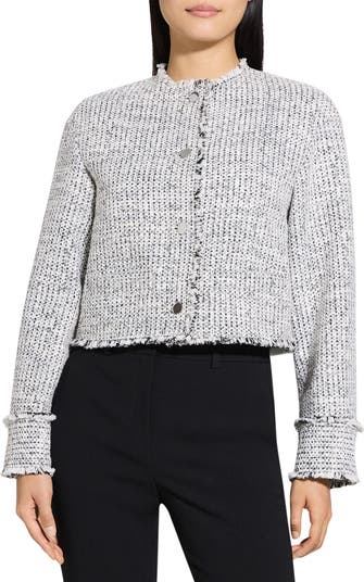Feathery edges bring texture and movement to this modern cropped jacket updated in classic workday tweed.