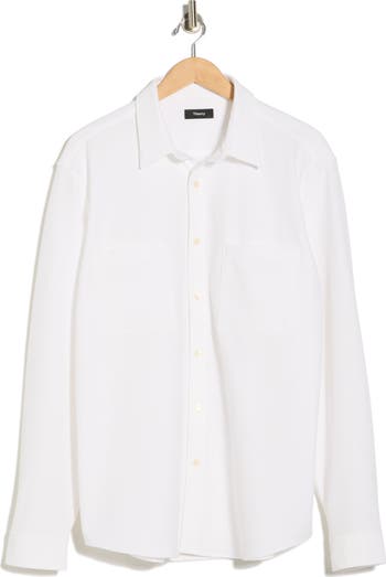 Look sharp in a snap in this button-up shirt cut from lightweight fabric with a subtly striped weave.