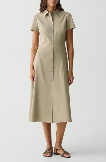A shirtdress for summery days features short sleeves and a linen-forward fabrication.