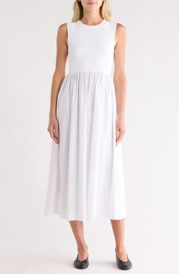 Elevate your off-duty wardrobe with this sleeveless midi dress balancing a soft knit bodice with a gracefully flared skirt.
