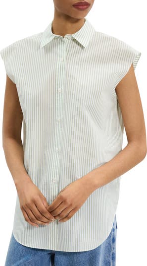 Cap sleeves extend the shoulder lines of a button-up shirt cut in a flowy length from an organic-cotton-rich blend.