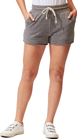 Comfy pull-on drawstring shorts feature convenient side pockets and raw hems for laid-back style.