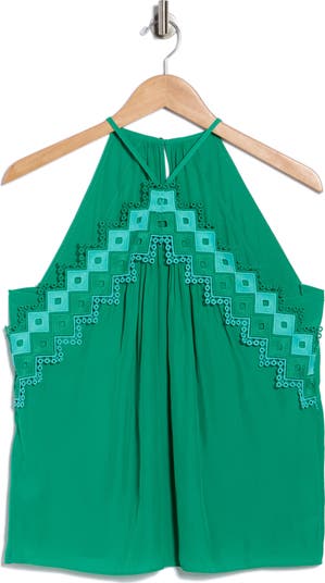 This flowy halter top is accented with delicate embroidered details, creating a lightweight silhouette with an artisanal feel.
