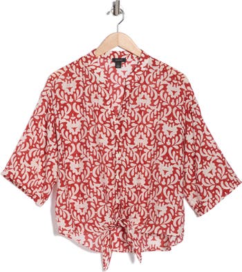 A tie-front detail at the hem shapes this Ikat-print top framed by a split neck and three-quarter sleeves for breezy, sun-ready appeal.