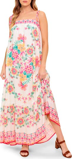 Tie shoulder straps highlight the square neck of this printed maxi dress finished with a generously flowy skirt.