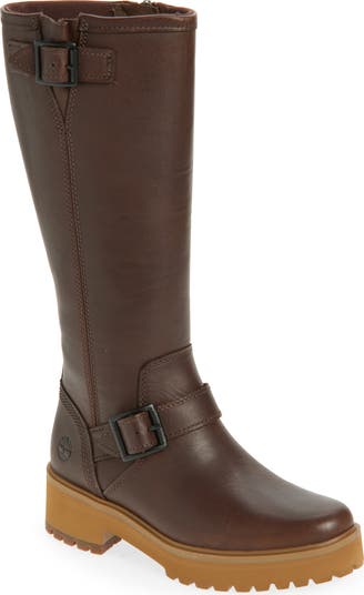 Polished buckles and a side zipper secure the shaft of a knee-high boot made of supple leather built with an OrthoLite® cushioned footbed atop an adventure-ready lugged sole.