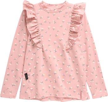 Floral sprigs are scattered on a stretch-added mock-neck cotton top that's accented with sweet ruffles.