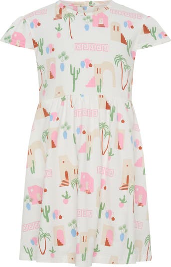 A A Mediterranean-inspired print brings sunsoaked vibes to a fit-and-flare dress made from soft, stretch-added cotton jersey.