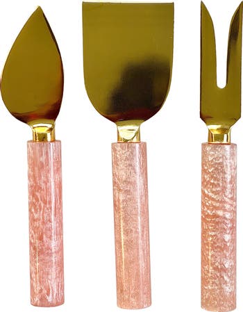 An elegant tablescape awaits this luxurious cheese serving set crafted from opalescent resin and smooth wood.