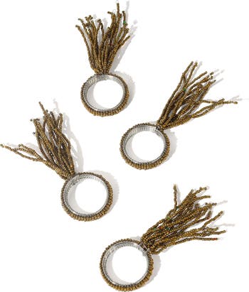 Inspired by lush, wind-swept ornamental grass, this set of four shimmering metallic bronze and olive seed-beaded napkin rings brings a luminous touch to hosting.