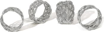 Handcrafted in India from platinum-toned wire woven into a continuous open-weave lattice, this set of four beaded napkin rings brings a luminous touch to hosting.