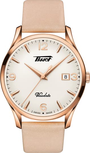 Tissot celebrates their ingenious idea to put a date on their fine Swiss watches with this '50s-inspired timepiece featuring large numerals and sharp stick indexes.
