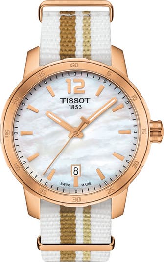 - - Series: Quickster - Gender: Unisex - Case Material: Rose gold-tone stainless steel - Dial Color: Mother of pearl with date window - Hands: Luminous rose gold-tone - Markers: Rose gold-tone indices and Arabic numerals - Strap Material: Striped nylon - Interchangeable Straps: Two solid color nylon - Closure: Tang - Movement: Swiss quartz - Crystal: Scratch Resistance sapphire - Case Diameter: 40mm - Case Thickness: 9.12mm - Water Resistance: 100 meters/330 ft - Strap Width: 19mm - Strap Length: 8" - Bezel: Fixed with Arabic numerals - Battery - Made in Switzerland