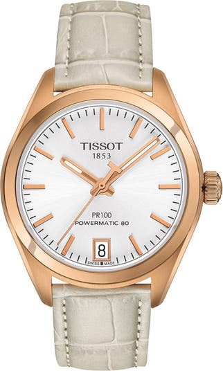 - - Style #: T1012073603100 - Series: PR 100 - Gender: Women's - Case Material: Stainless steel - Dial Color: Silver with date window - Hands: Luminous gold-tone - Markers: Gold-tone indices - Strap Material: Embossed leather - Bracelet strap length: 16mm - Closure: Folding clasp with push-buttons - Movement: Swiss quartz - Crystal: Scratch-resistant sapphire - Case Diameter: 33mm - Bracelet Width: 16mm - Water Resistance: 100 m / 330 ft / 10 bar - Automatic - Made in Switzerland