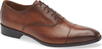 A burnished finish enhances the polished style of this cap-toe leather oxford grounded by arch-supportive cushioning and a low block heel.