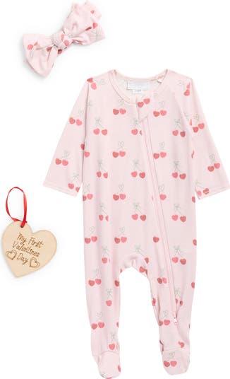 Keep your little one looking cute and feeling comfy in this long-sleeve jersey footie complete with a matching headband and 'My First Valentine's Day' ornament