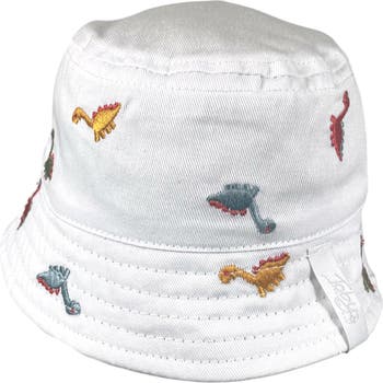 A woven bucket hat with colorful dinosaur embroidery adds a burst of sunshine to your baby's outfit.