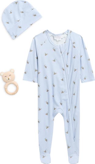 Your little one will love the cozy, jersey fabric of this long-sleeve footie that comes with a matching hat and adorable teether.