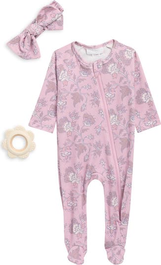 Your little one will love the soft and breathable fabric of a long-sleeve footie with a matching bow and wooden teether.