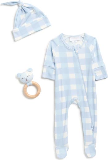 Baby will slumber soundly in the supremely soft and stretchy comfort of this pajama set featuring a gingham layette with a matching beanie and bunny rattle.