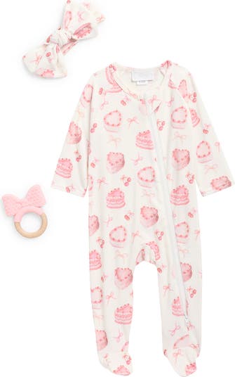 A charming print distinguishes the soft and cuddly footie in this set for baby that's finished with a coordinating headband and teether.