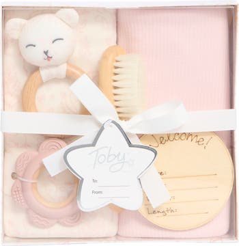 Welcome your baby in this delightful set that comes complete with a teether toy, rattle, hair brush and assortment supersoft wash and wrap cloths.