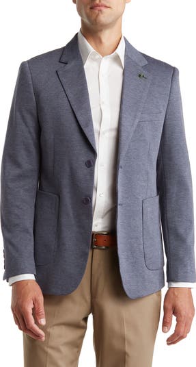 A notch-collar jacket designed with 4-way stretch features a wrinkle-resistant finish for refined style.