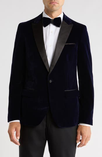 Cut from soft velvet and ready for making entrances, this spotlight-stealing dinner jacket features black satin on the buttons, lapels and pocket trim for a smart, polished look.