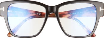 Chunky squared reading glasses with T-wrapped corners are fitted with special lenses to block blue light from tech and reduce strain on the eyes.