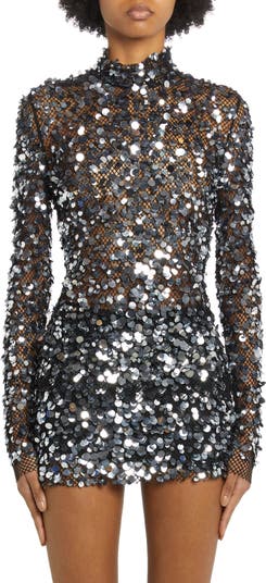 Sparking up conversation comes easy with this glittering sequin-embellished mesh top designed in a close-fitting cut with a posh mock neck.