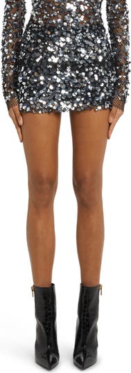 Cascading pailletes dangle from open netting on this showstopping mini with a grosgrain waistband and shine to spare.
