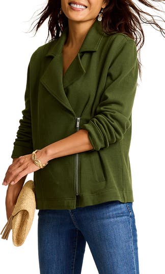 This lightweight and edgy jacket is designed with moto-inspired notched lapels and silvery zipper details, while its soft stretch-kissed cotton design keeps the look cozy.