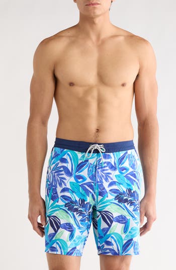 Breeze through your beach days in these comfortable board shorts covered in a tropical frond pattern.