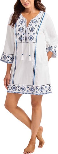 Contrasting embroidery brings color to this organic-cotton cover-up tunic made with handy pockets to hold your essentials.