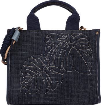 Crafted from rich dark denim, this tote is accented with beautifully stitched tropical leaf embroidery for a signature touch of sophistication. The structured silhouette features woven top handles for comfortable hand carry, while a removable braided crossbody strap offers versatile, hands‑free styling when you’re on the go.