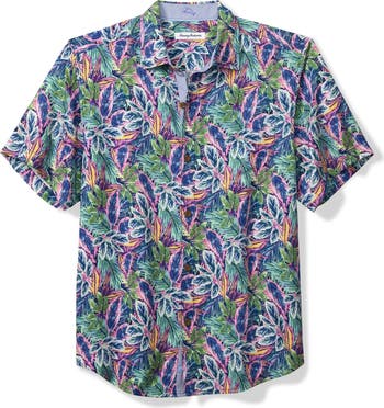 Vivid tropical blooms energize this vacation-perfect button-up updated with abbreviated sleeves and elevated in luxe silk.