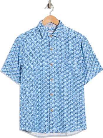 A geometric pattern brings sun-ready vibes to this short-sleeve button-up shirt cut from pure silk.