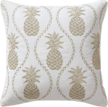 Bring a tropical feel to any space with this square accent pillow showcasing metallic embroidered pineapples against a neutral background.